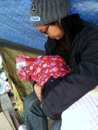 嬰兒的啼哭聲引起了我的注意,於是我走近其中一家的棚子,想詢問一下情況。地震發生時,付秋蓉趕緊跳上床抱住剛滿30天的孩子,卻一起被地震搖到床下。她抱著孩子,和丈夫竹禹舟躲到了衛生間。